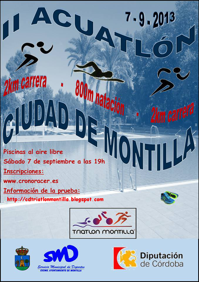 El II Acuatlón Ciudad de Montilla es una prueba que combina la natación y la carrera a pie que celebraremos el próximo día 7 de septiembre de 2013 con dos modalidades: una prueba para mayores y otra para menores.